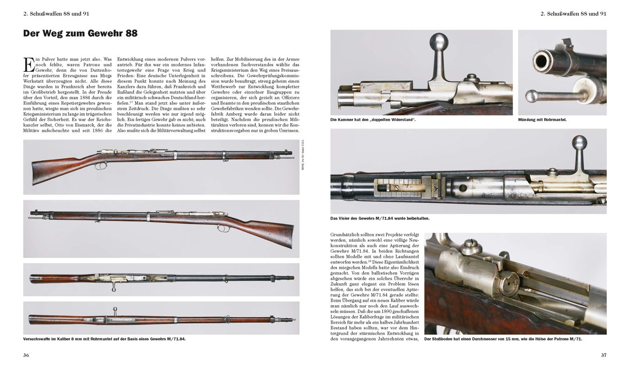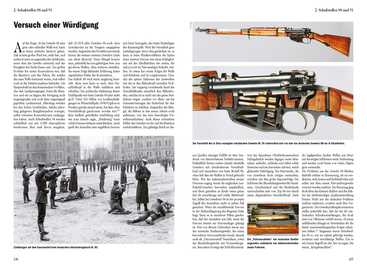 The 88 model weapons went through two periods of usage: the first began with the hasty rearmament of the German armies around 1890 and ended with the introduction of the 98 models in the years leading up to 1914. It was during the First World War, when a serious shortage of firearms made itself felt, that many of these weapons, which had already been decommissioned, were once again taken out of the depots and reactivated. Both of these periods are covered in this book.