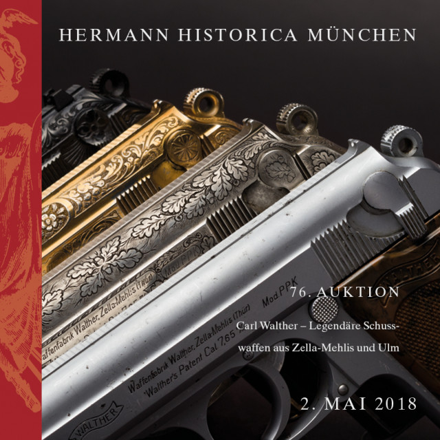 02. Mai 2018, Carl Walther – Legendäre Schusswaffen aus Zella-Mehlis und Ulm, 379 Lose, 238 Seiten, Fadenbindung, Beschreibungen in deutscher Sprache, z.T. englische Übersetzungen