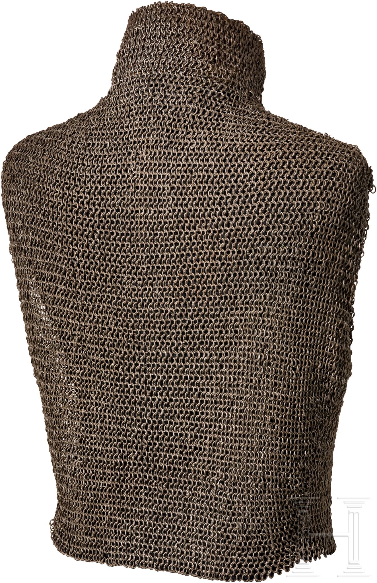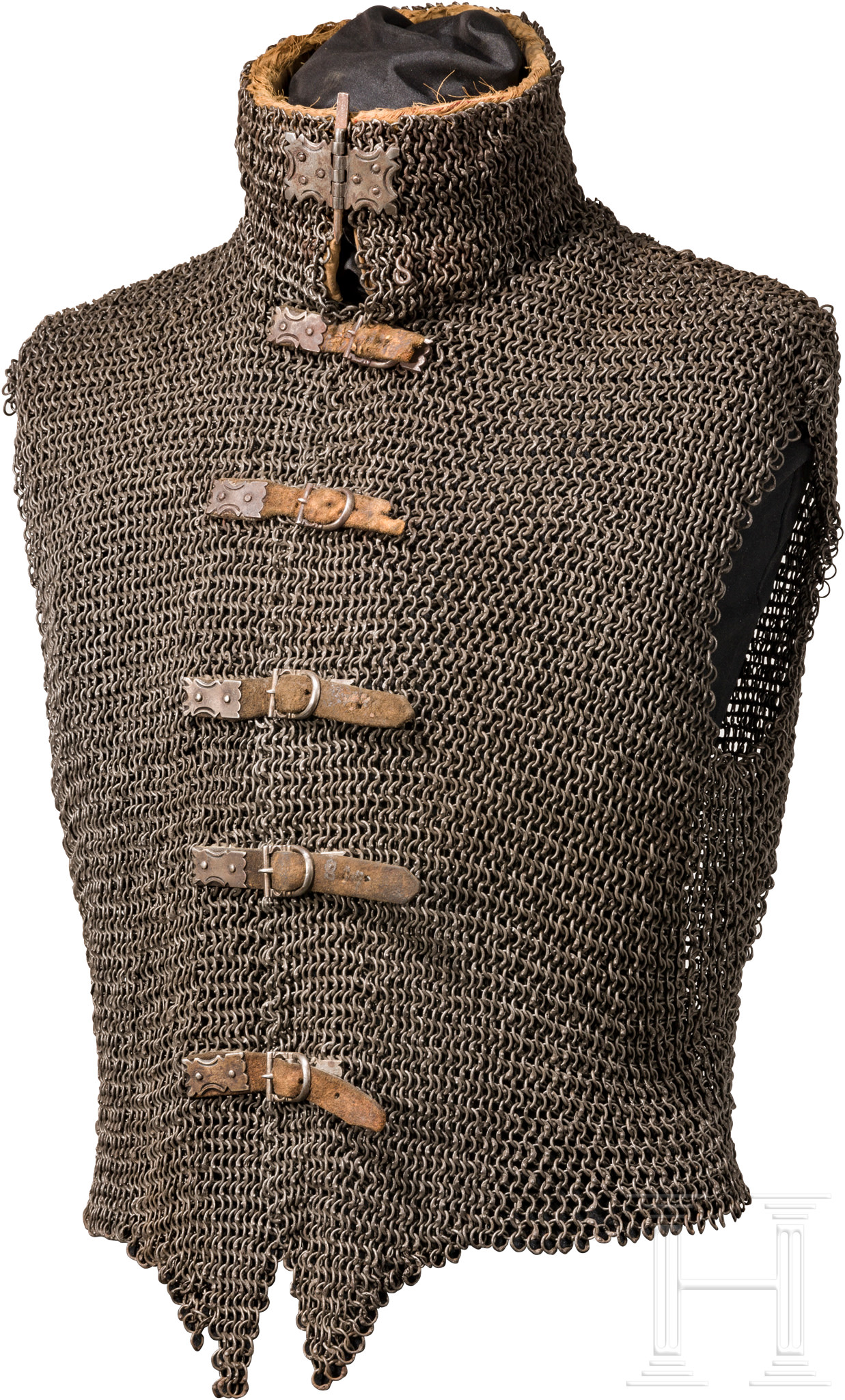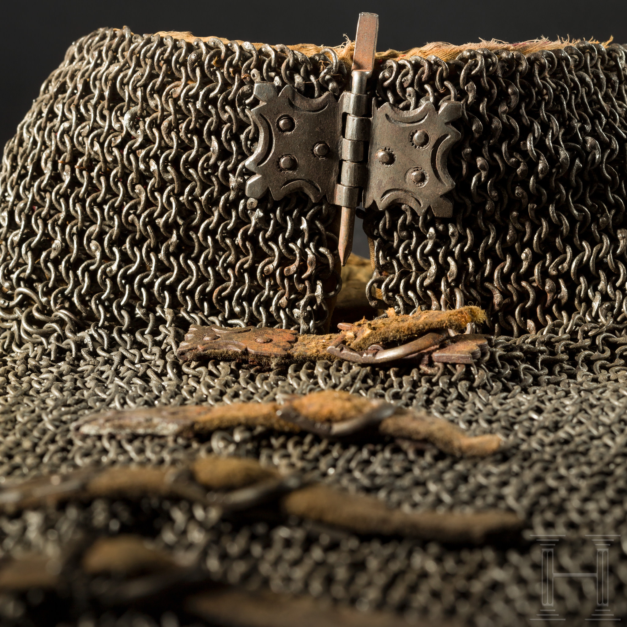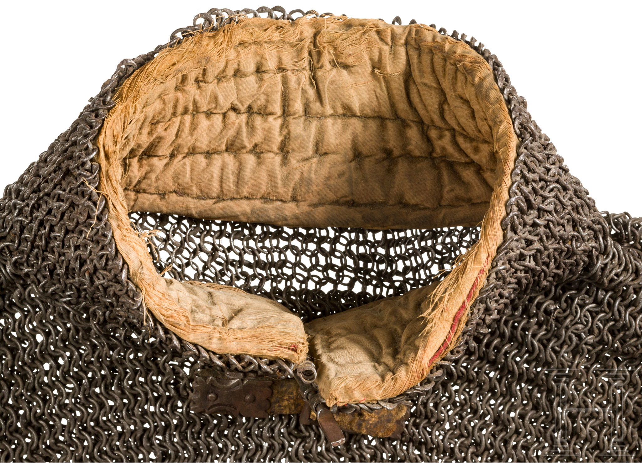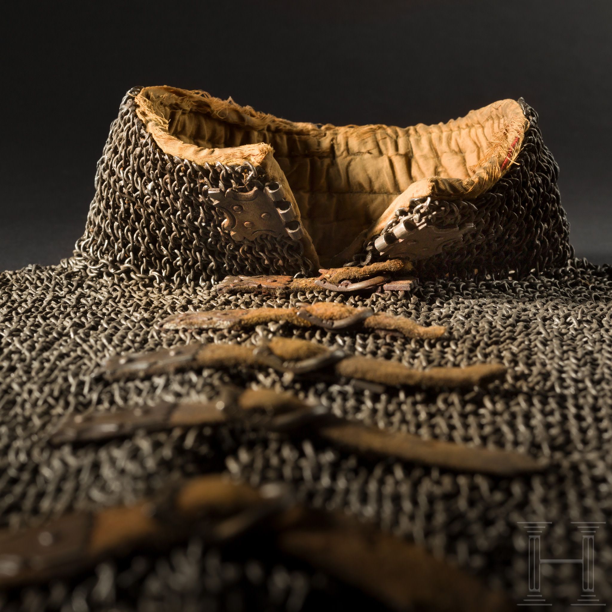 Close-fitting, waisted vest of riveted chain mail. Attached collar of fine-mesh chain mail. On the breast five original fastening straps of leather with iron buckles and fittings. The collar with two iron fastening loops and push-through pin. Inside the collar original cloth lining covered with tan silk, the edges partly worn. Length 57 cm.Rare body armour that was usually worn underneath the doublet. Vests of this kind served as protection while travelling through unsafe territory, but were occasionally also worn in towns and at court for fear of treacherous assassination attempts. Of great rarity and museum importance.Condition: II + Questions about the lot?