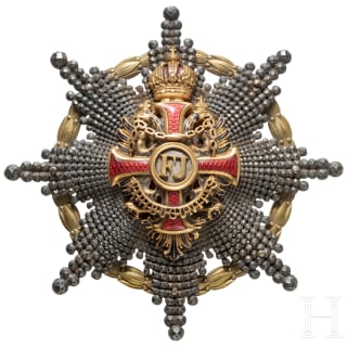 Patrize und Matrize, jeweils in Stahlausführung. Großer sechsarmiger Stern mit kleinen fünfstrahligen Sternen zwischen den Kreuzarmen. Durchmesser der Prägefläche 93 mm mit unterseitiger Abflachung zur passgerechten Aufnahme der Matrize. Höhe 88 bzw. 75 mm.Aus dem Nachlass eines deutschen Ordensherstellers.