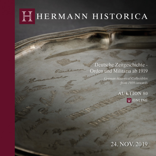 Our catalogue for our online auction "German Historical Collectibles from 1919 onwards" includes 772 lots. The descriptions are in German, with English translations of objects above a certain threshold. The printed catalogue on high-gloss paper is in the format 21x21 cm. In our high-quality catalogue with softback all lots are illustrated in color.