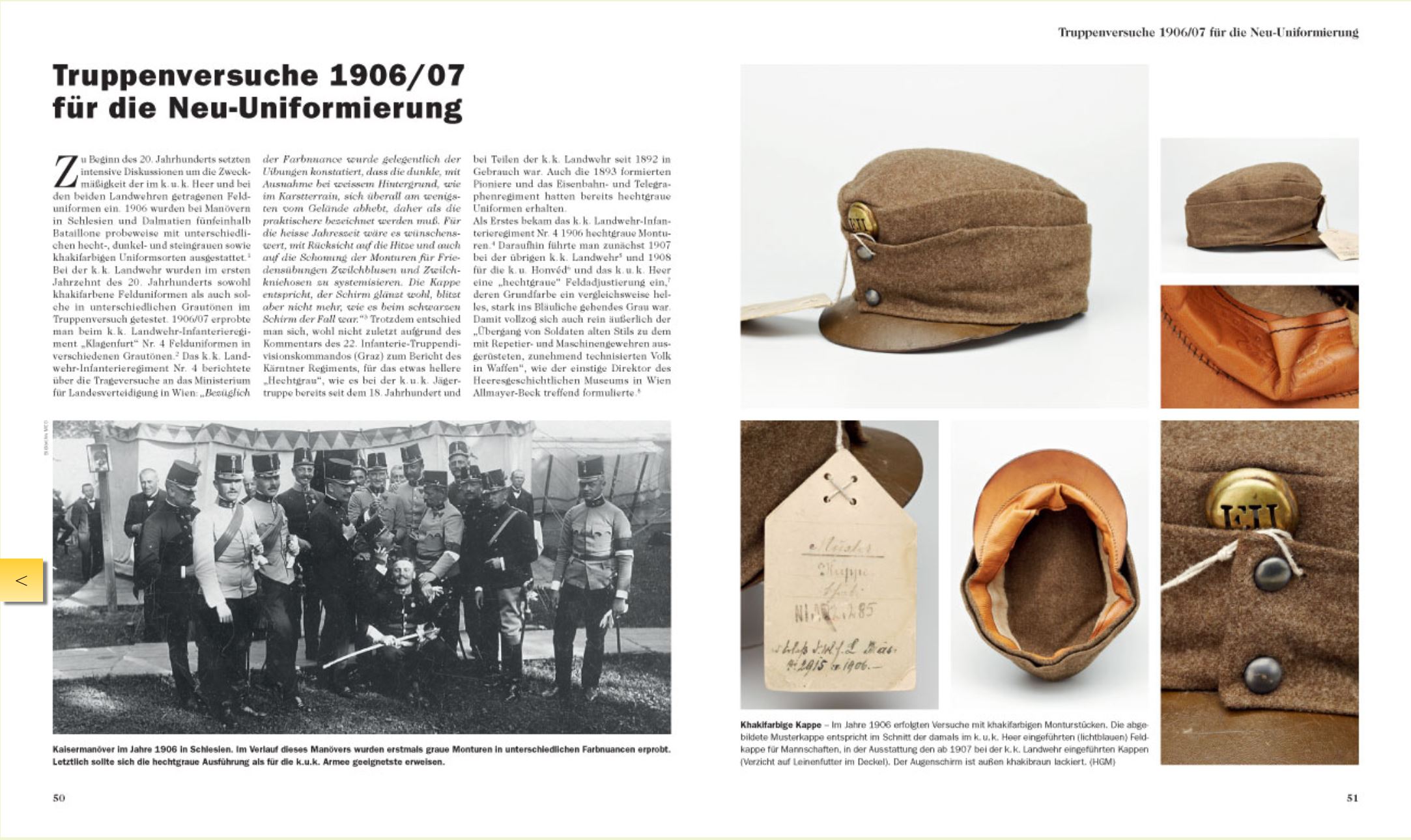 Band 1 stellt die k.u.k. Armee im Spannungsfeld des österreichisch-ungarischen Dualismus von 1867 bis 1914 und die Entwicklung der Felduniformen vor 1914 in den Mittelpunkt. Der bei der k.k. Landwehr schon 1907, beim gemeinsamen k.u.k. Heer und der k.u. Honvéd ab 1908 eingeführten hechtgrauen Ausmarschadjustierung und den Besonderheiten der bis 1915 noch „bunt“ adjustierten Kavallerie sind umfangreiche Kapitel gewidmet. Schließlich werden die feldgraue Adjustierung ab 1915 in ihren zahlreichen Varianten, die Kriegswirtschaft in Zeiten des immer akuter werdenden Materialmangels, Distinktionen und Truppenabzeichen beschrieben. Es ist gelungen, für viele Montursorten originale Einreichmuster abzubilden.