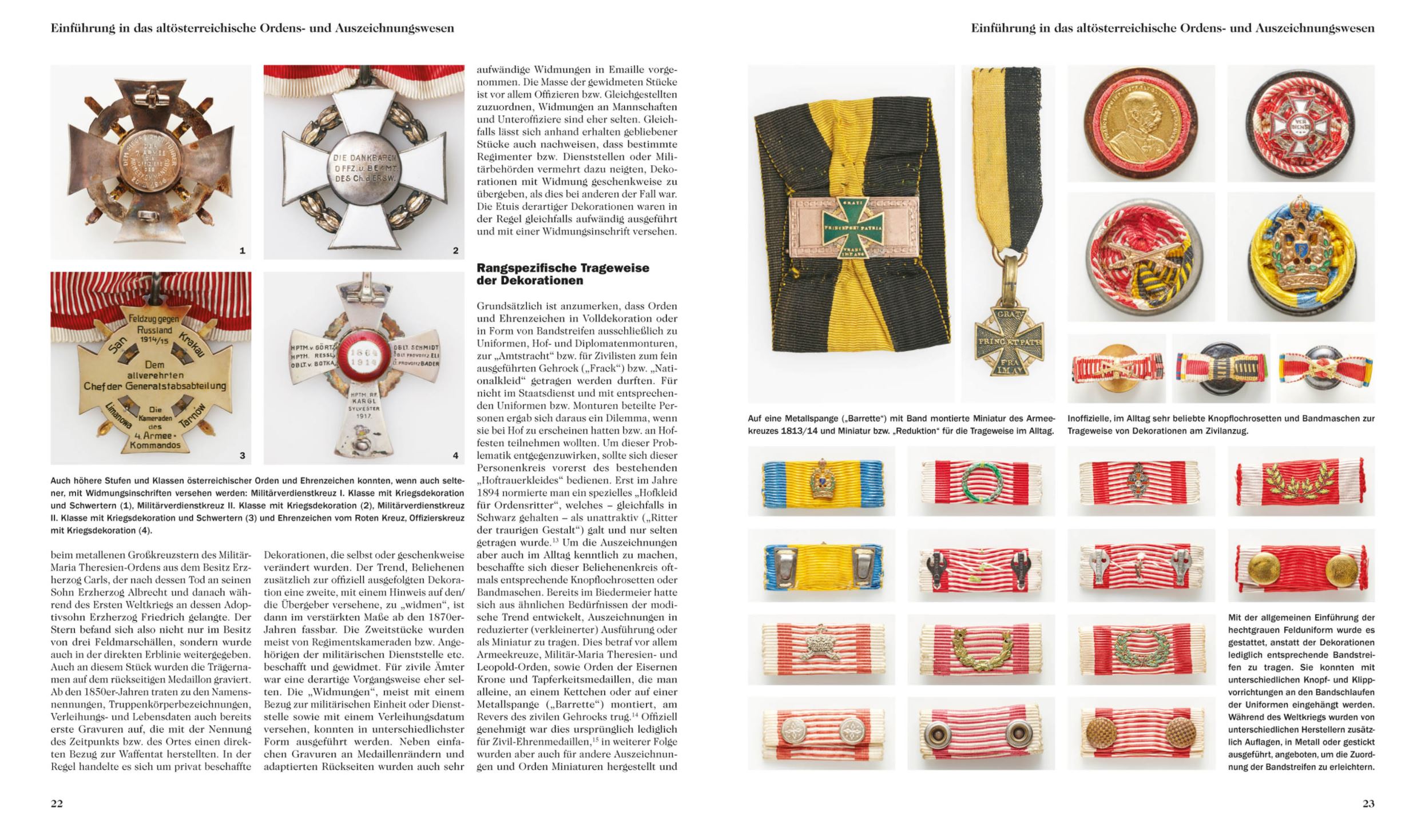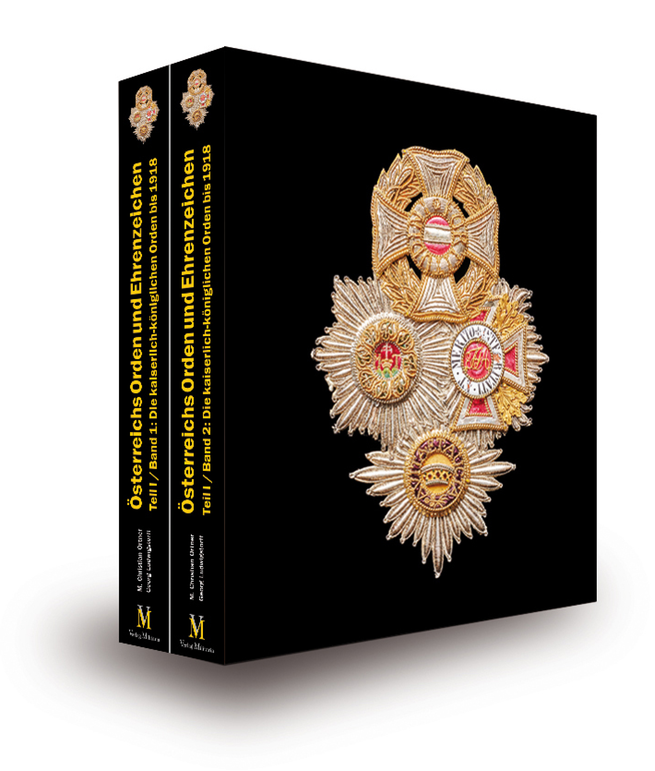 Dadurch entstand nicht nur ein umfassendes, sondern auch komplexes Auszeichnungssystem, welches im Vergleich zu anderen Staaten durchaus seine Besonderheiten aufzuweisen hatte. Etwa die mit einzelnen Ehrenzeichen verbundenen Privilegien, materielle Zuwendungen oder die Erhebung in den Adelsstand. Auch die Rangordnung der Orden und Ehrenzeichen untereinander war genau geregelt. In diesem Doppel-Bildband stehen neben der kulturhistorischen Entwicklung vor allem die Insignien selbst im Mittelpunkt. Sie werden in einer bisher noch nie publizierten Fülle und Dichte in einer Monographie auf 832 Seiten zusammengefasst und auf mehr als 2.500 Fotos und Abbildungen dargestellt. Dieser Teil I der geplanten Reihe umfasst: Orden vom Goldenen Vlies, Militär-Maria Theresien-Orden, St. Stephan-Orden, Leopold-Orden, Eiserner Kronen-Orden, Franz Joseph-Orden, Sternkreuz-Orden, Elisabeth-Orden und Orden der Sklavinnen der Tugend.