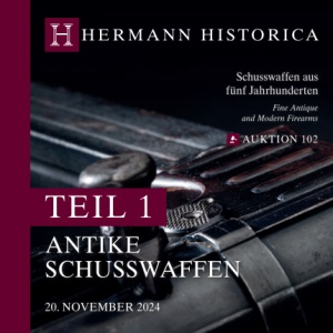 | 125 7156 Miqueletflinte, Eibar, datiert 1852 Brünierter, achtkantiger, in rund übergehender Lauf mit glatter Seele im Kaliber 17 mm. In Silber eingelegtes Spinnenkorn, in der Laufmitte geschnittener Akanthusfries auf goldunterlegtem Grund vor eingelegtem Silberband. Über der Kammer in Silber eingeleger Rankendekor und Signatur „Fabricadu per Josf Ramon Gabiola en Eibar ano 1852“. Leicht graviertes Schloss, der Hahn in Form eines sitzenden Löwen geschnitten. Halbschäftung aus Nussbaumholz, die glatte eiserne Garnitur mit Rankengravur. Kolbenfach mit federverriegeltem Sprungdeckel. Zwei bewegliche Riemenösen, der Ladestock fehlt. Länge 129 cm. 328352 II + € 460 7157 Perkussions-Doppelflinte, Manton, England, um 1860 Kal. .63(BlackPowder), Nr. ohne, blanke Laufseelen. Lauflänge 85 cm. Vermutlich neu bräunierte Läufe. Aushakbares Laufbündel. Schwanzschraube locker. Perlkorn. Schlosse mit vorliegenden Federn. Schlossplatten gemarkt mit „Manton“. Hähne mit Knauf. Schlossplatten und Hähne sowie Abzugsbügel dezent graviert. Doppelabzug. Ladestock. Dunkler Nussbaumschaft mit feiner Fischhaut und langgezogener Schaftbacke. Stählerne Schaftkappe. Waffe ist zur Gänze aufgefrischt. Länge127 cm. Erlaubnispflichtig. 322507 II - € 480 7158 Perkussions-Doppelflinte, Perin Lepage à Paris, um 1860 Kal. .75(BlackPowder), Nr. 8, schweres, aushakbares Laufbündel aus feinem Banddamast. Breite Laufschiene aus Hufnageldamast. In der Schiene in Gold eingelegt „Perin Lepage Brevete à Paris“. Laufhersteller „Freres Leclerc“ mit Punze an der Unterseite der Läufe vermerkt. Fast blanke Laufseelen. Länge 76 cm. Elegant ausgeführte Hahnschlösser mit vorliegenden Federn und fein modellierten Hähnen. Schlösser und Hähne mit dezenter Rankengravur und nochmaliger beidseitiger Herstellersignatur. Doppelabzug. Am gravierten Abzugsbügel in Gold eingelegtes Besitzermonogramm „G M“. Dunkler, sehr schön erhaltener Nussbaumschaft mit Fischhaut und blanker eiserner Kolbenkappe mit darüber angebrachter Krone. Originaler Ladestock mit Dopper und Krätzer. Gesamtlänge 117 cm. Erlaubnispflichtig. 311675 I - € 1.300 7159 Perkussions-Doppelflinte mit WL-Perkussions-Büchsflinte im Koffer, deutsch, um 1860 Kal. 14(BlackPowder), Nr. 2-1, blanke, aushakbare, unsignierte Läufe aus gebräuntem Banddamast mit breiter, sich nach vorne verjüngender Laufschiene und Perlkorn. Länge 82 cm. Sehr aufwendig gestaltete Hahnschlösser mit vorliegenden Federn. Hähne mit Sicherung. Ansprechend gravierte Schlossplatten, Hähne und Abzugsbügel. Doppelabzug mit Stecherschraube im vorderen Abzug. Dunkler Nussbaumschaft mit Fischhaut und langgezogener Backe. Eiserne Kolbenkappe. Ladestock. Länge 122 cm. Mit dabei Wechsellaufbündel als Büchsflinte. Auf der Laufschiene gemarkt mit „Engelking A. Hannover“. Läufe äußerlich blank. Ladestock. Das Ganze in einem Holzkoffer mit den Maßen 85 x 25 x 11 cm. Innen mit samtartigem grünen Stoff ausgeschlagen. Im Deckel befindet sich ein Etikett der Firma „Störmer in Herzberg“, darüber ein Etikett der Firma „Engelkingsche Büchse und Flinte“. Kofferschloss lose im Koffer liegend, da ausgebrochen, mit Schlüssel. Erlaubnispflichtig. 326472 II € 1.400 7159 7156 7157 7158
