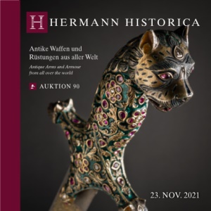 1132 Schwerer Savoyarden-Helm, Norditalien, um 1600 Schwere, zweiteilig geschlagene Kalottemit flachemgebördeltenKamm und einteilig gearbeitetemNackenschirm. Aufschlächtiger Augenschirm mit zwei halbrunden Augenöffnungen. Aufschlächtige, leicht gegratete Visierplattemit runden, gebördeltenAugenausschnitten. Horizontal ge- schlitzte Mundöffnung. Aufschlächtiges Kinnreff, die Gesichtsöffnung mit fein gebördeltem und geschnürtem Rand. Vernietete Kragenplatte. Oberflächen leicht narbig. Höhe 30 cm, Gewicht 4.489 g. Der Name „Savoyarden-Helm” entstand nach der erfolglosen Bela- gerung der Stadt Genf durch den Herzog von Savoyen im Jahr 1602, bei dem die Schweizer große Mengen dieser Helme erbeuten konnten. Aufgrund der runden Augenöffnungen werden sie auch gerne als Totenkopf-Helme bezeichnet. Siehe auch: Godoy, Josef A., Les armets savoyards du Musée d’art et d’histoire de Geneve, Genf 2002. A heavy North Italian helmet of Savoyard type, circa 1600 The heavy skull forged in two pieces, with a flat, turned comb, the neck guard forged as one piece. The pivoted peak with two semi-circular eye holes. The pivoted, slightly ridged visor plate with round, turned eye openings. Horizontal slotted mouth opening. Pivoted bevor, the face opening with a finely turned and roped edge. Riveted collar plate. Light pitting on the surfaces. Height 30 cm, weight 4,489 g. The helmet “Savoyard” was named after the unsuccessful siege of the city of Geneva by the Duke of Savoy in 1602, during which the Swiss managed to capture large quantities of these helmets. They are often referred to as death’s head helmets on account of the round eye open- ings. See also: Godoy, Josef A., Les armets savoyards du Musée d’art et d’histoire de Geneve, Geneva 2002. 285922 II - € 10.000 104 |